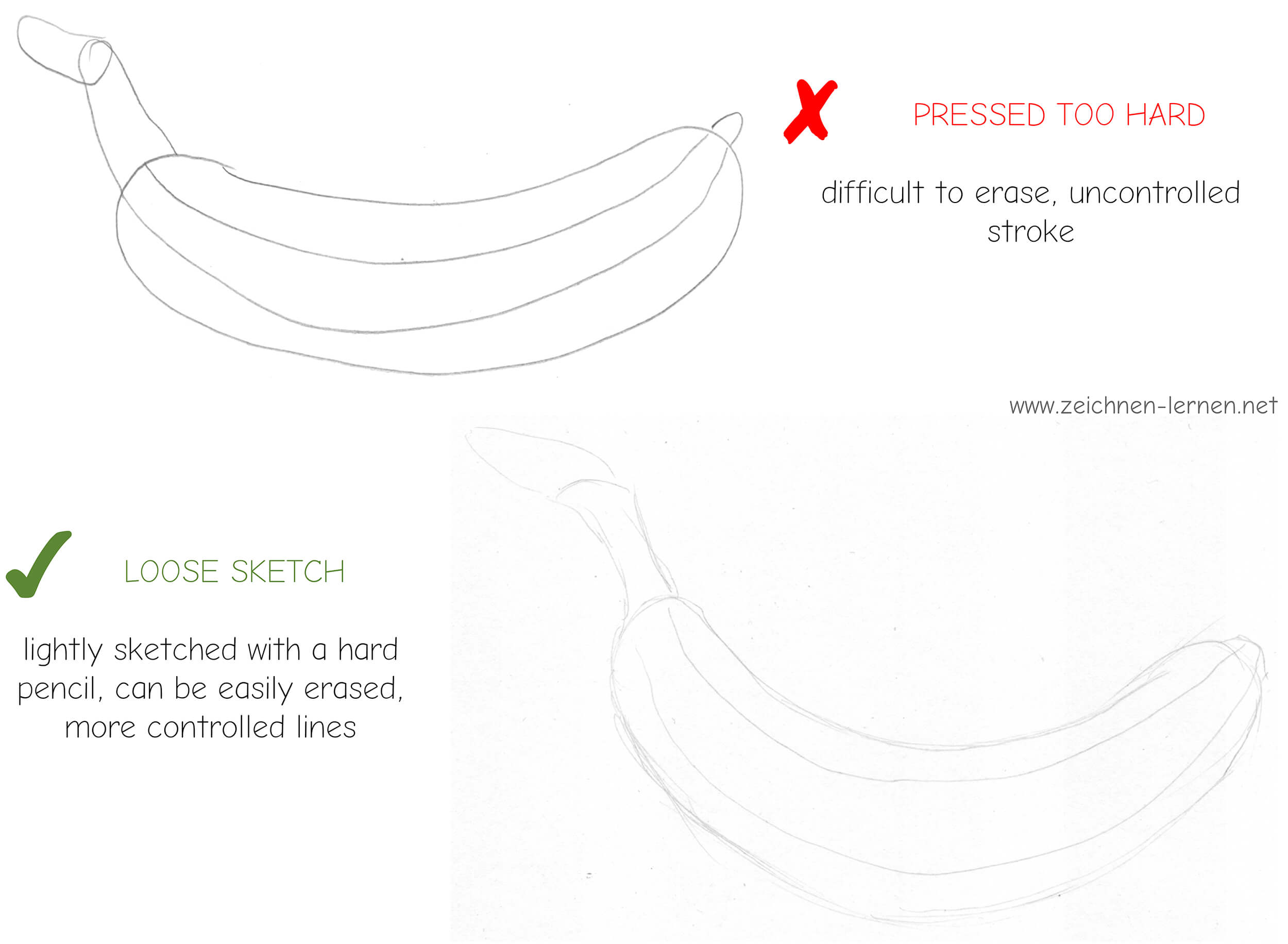 Especially as a beginner, you tend to draw the outlines too heavily. Either you press too hard while drawing, or you draw several lines right next to each other. In this case, it’s helpful to do some relaxation exercises to practice drawing with a steady hand. In general, lines should be drawn loosely, lightly, and subtly at first. As you develop the sketch, you gradually increase the pressure.