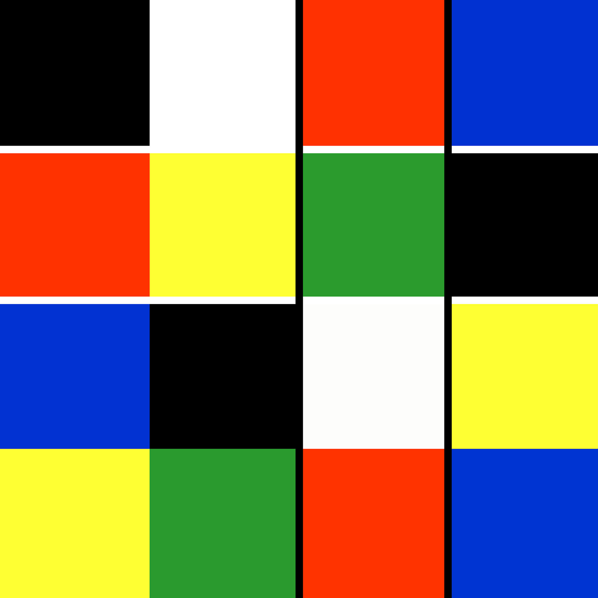 Este es el contraste más sencillo. Para ello se utilizan al menos tres colores puros y sin matices diferentes. El efecto es siempre de colores vivos. El blanco y el negro, utilizados como líneas divisorias entre los colores, pueden influir en el efecto. El blanco atenúa la intensidad de los colores, mientras que el negro la potencia.